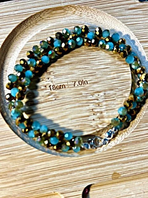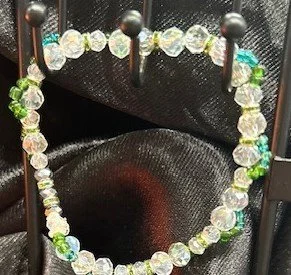 à facettes et perles de rocailles, couleur cristal et duo de vert turquoise et vert pomme (élastique nylon)