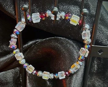 en perles à facettes argent et rubis, cube cristal en résine (élastique nylon)